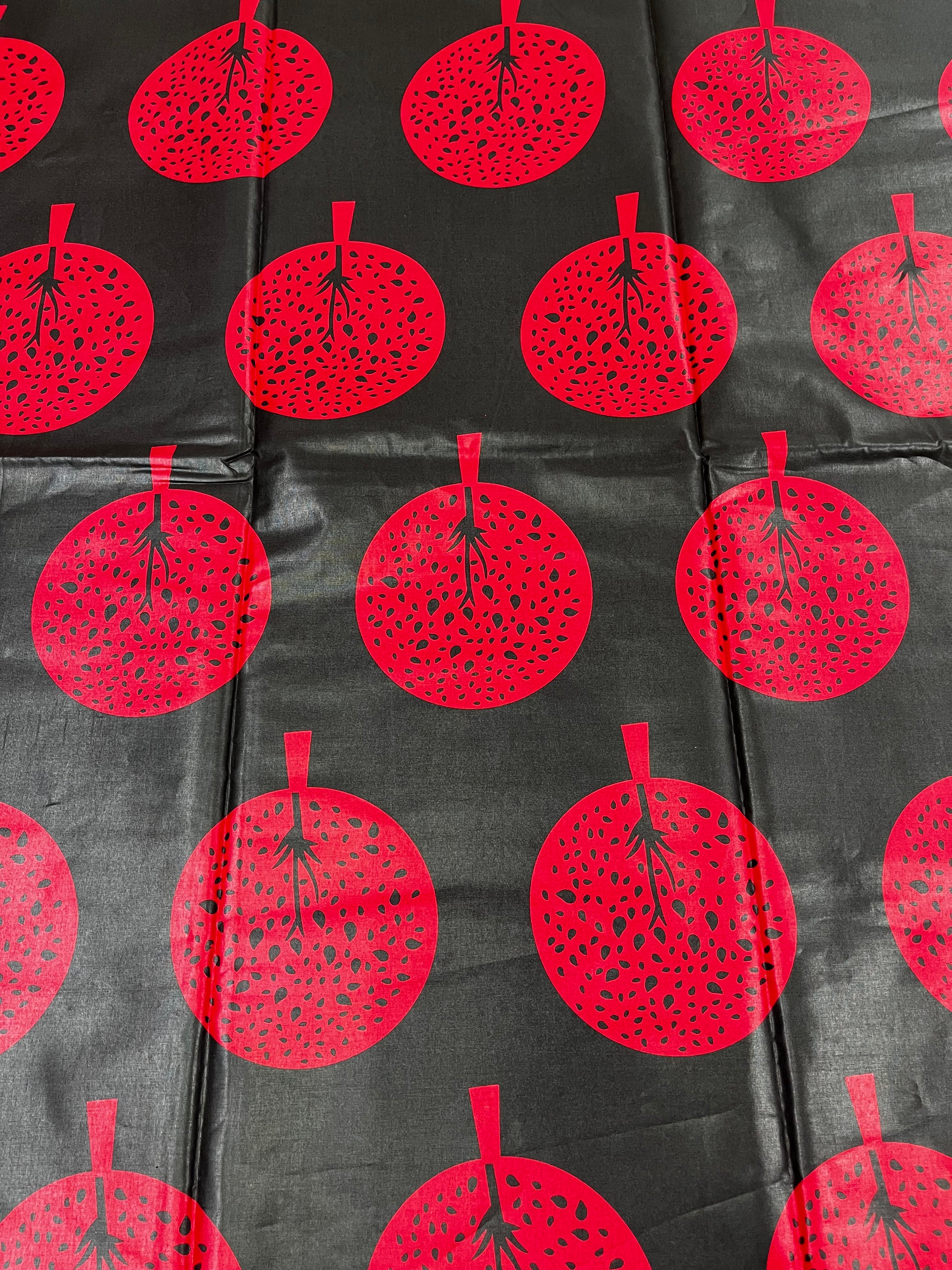 Bring bold elegance to your next design with this stunning Black & Red Ankara Print from Elliébea Fabric. This eye-catching pattern features vibrant red circular tree motifs set against a deep black background, creating a modern, striking look that stands out effortlessly